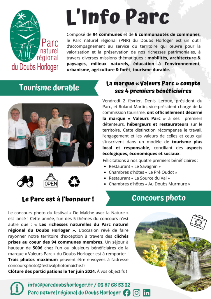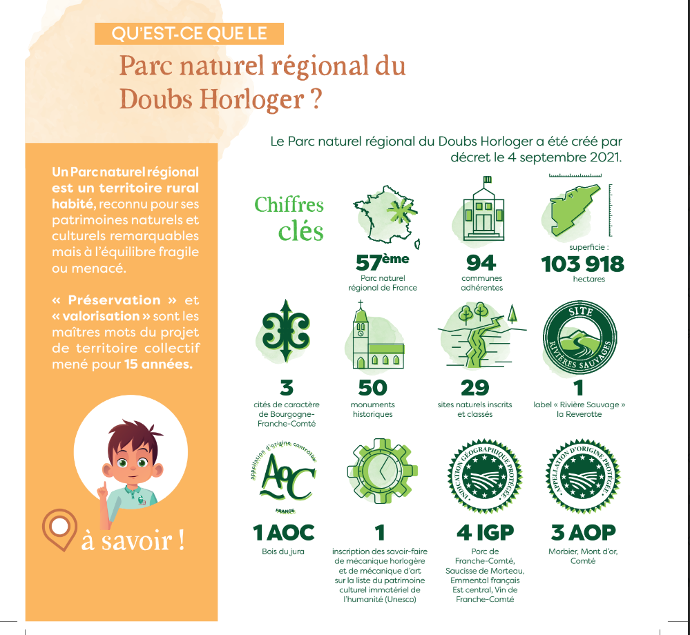 Le Parc Naturel Régional (PNR) du Doubs Horloger est le 57e Parc Naturel Régional de France. Son territoire s'étend sur le val de Morteau, le plateau du Russey, le plateau de Maîche ainsi qu'une partie des plateaux de Sancey-Belleherbe et de la communauté de communes des Portes du Haut Doubs. Son objectif est, comme pour tous les autres PNR, de protéger un patrimoine naturel et culturel unique qui définit la région. Pour cela, différents chargés de mission travaillent à la réalisation de tâches très variées : milieux naturels, tourisme, architecture, agriculture, énergies renouvelables, mobilités douces, économie, communication...